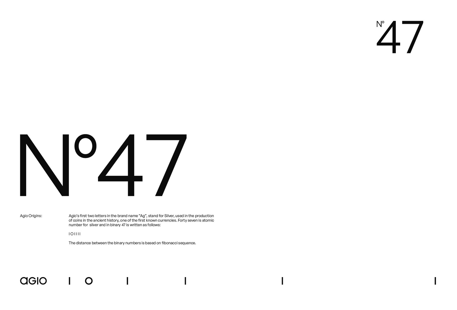 Agio’s first two letters in the brand name “Ag”, stand for Silver, used in the production of coins in the ancient history, one of the first known currencies. While “io” stands for input/output. Forty seven is atomic number for silver and in binary 47 is written as follows: